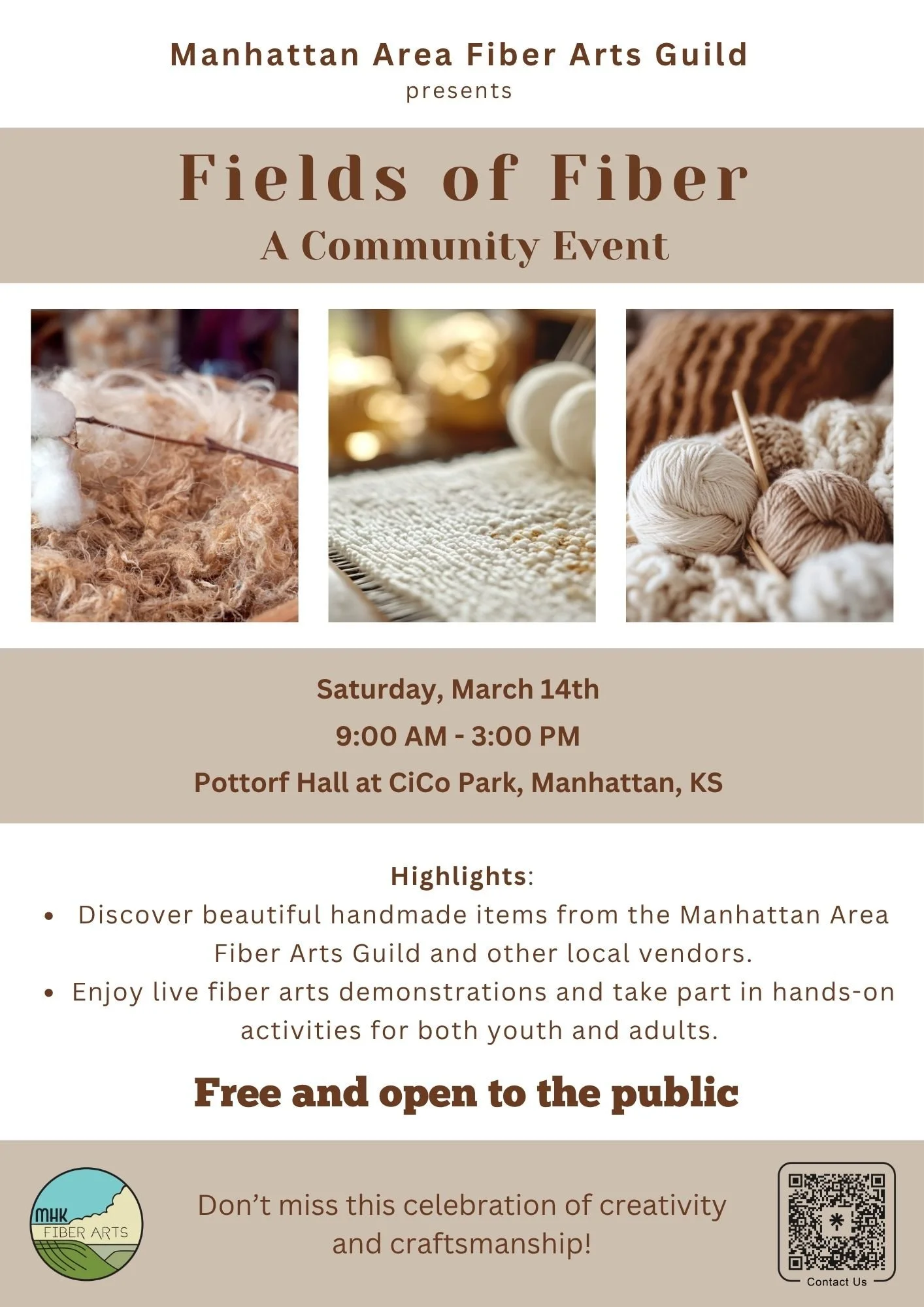 The Manhattan Area Fiber Arts Guild invites you to Fields of Fiber on Saturday, March 14, 2026. Explore hundreds of beautiful, handmade items created by Guild members and local vendors, watch live demonstrations, and enjoy hands-on activities for both youth and adults.